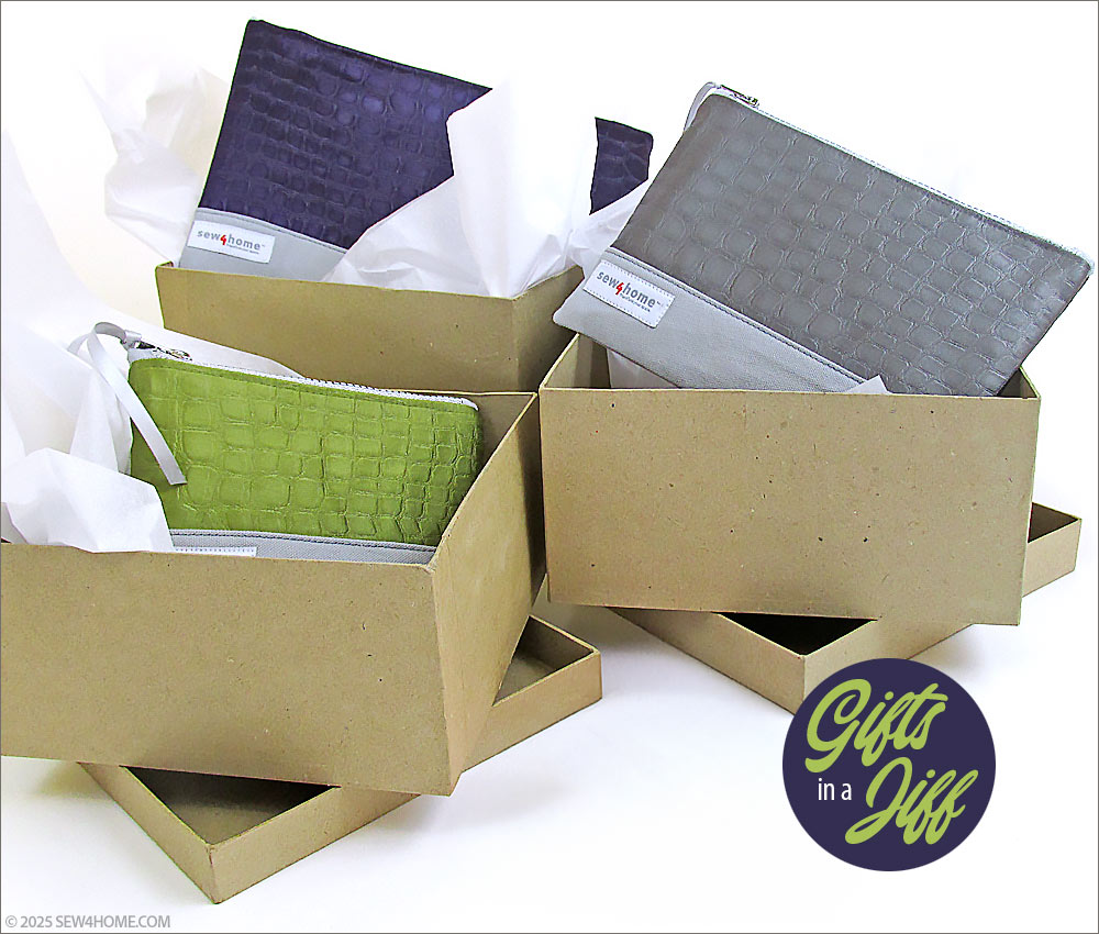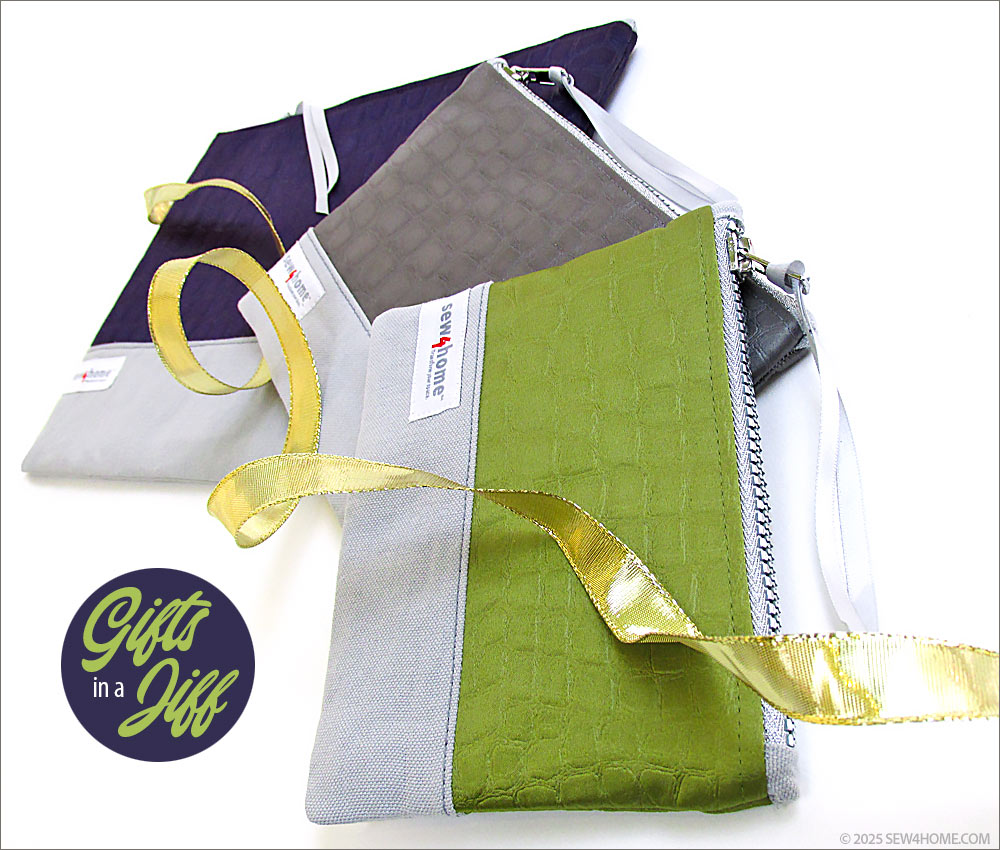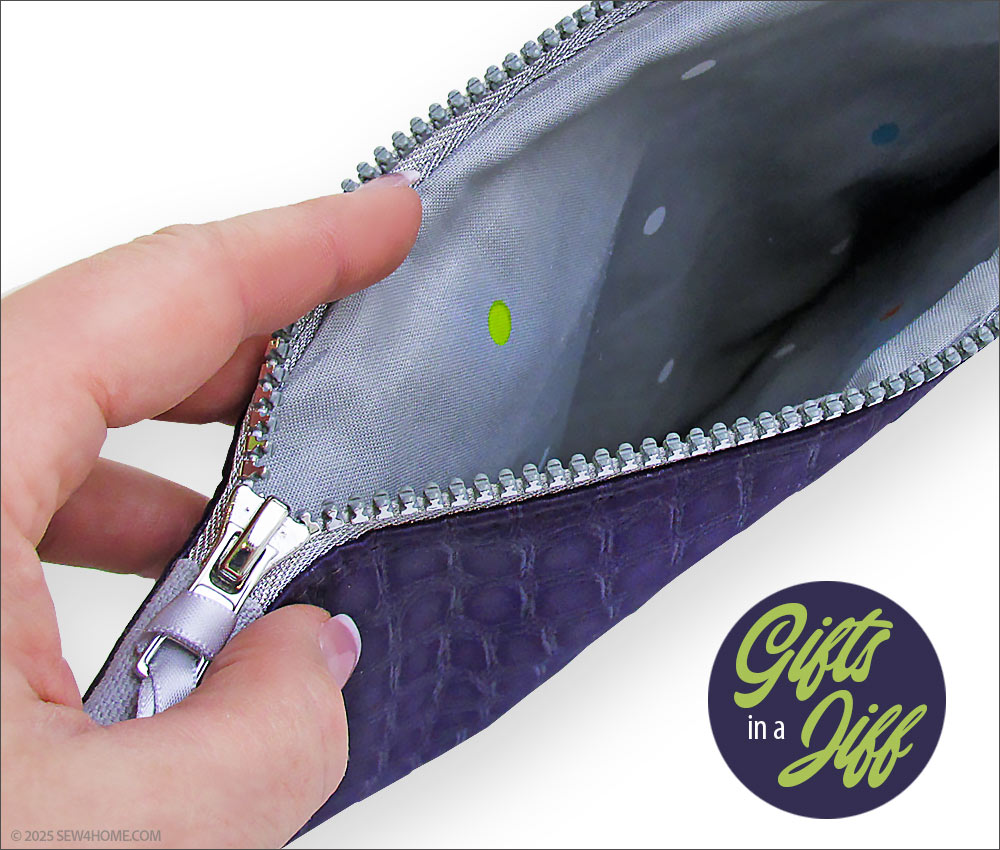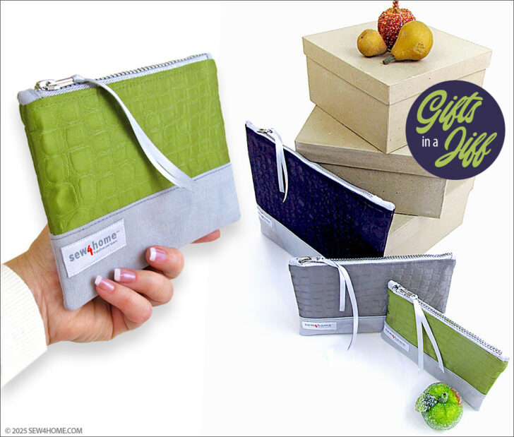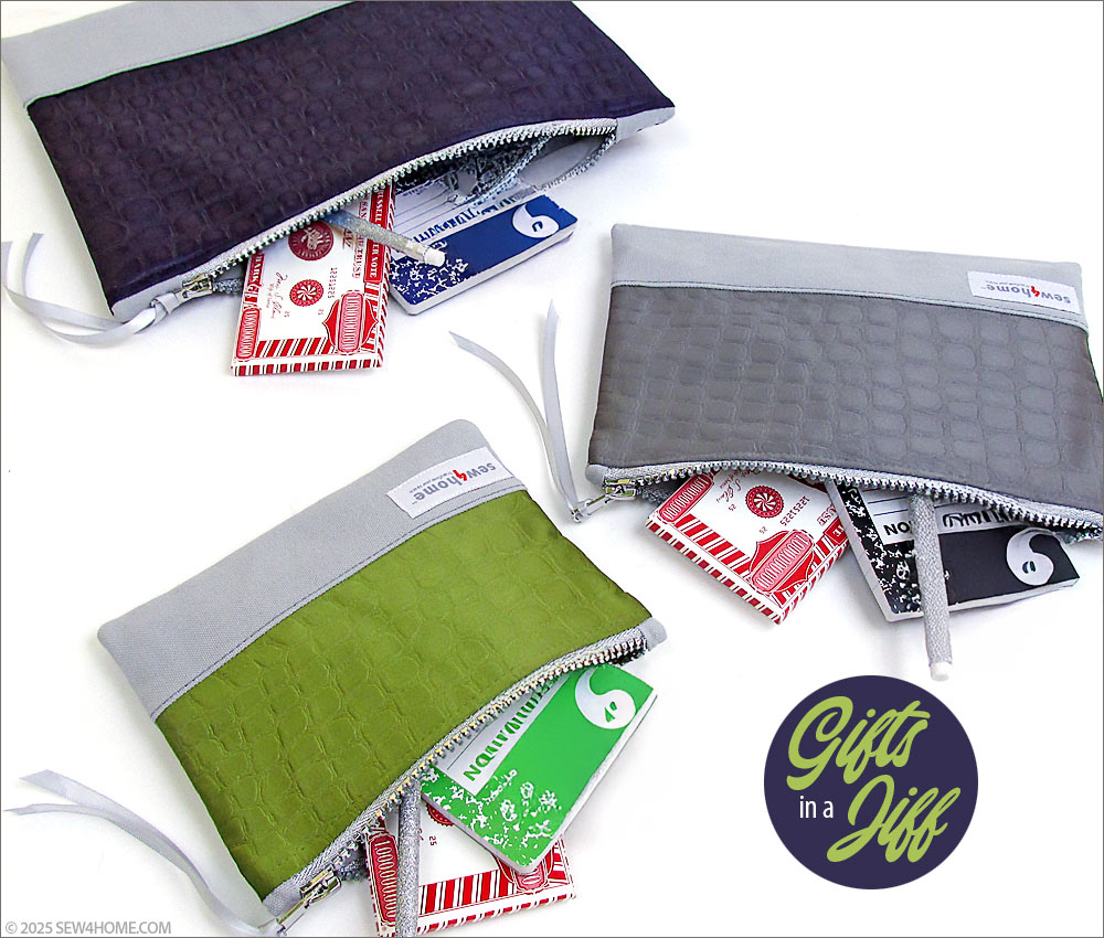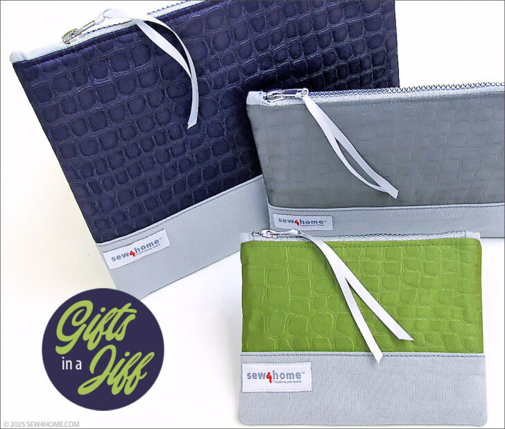 Just because a project includes a zipper doesn’t mean it can’t be done in a zip. A top zipper with end tabs is one of the easiest zipper installations you can do. This small, medium and large set of posh little pouches combines a luscious, jewel tone satin with a sturdy cotton twill. To bring the trio together as a set, we matched the base fabric and lining, and added coordinated metallic zippers.