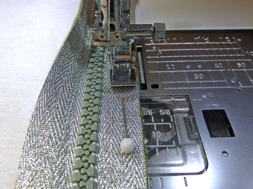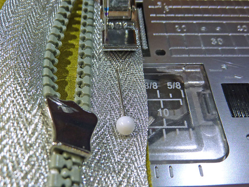 - Go slowly. When you can start to feel you’re approaching the zipper pull, stop with your needle in the down position. Twist your fabric around slightly and carefully close the zipper. Re-position your fabric and finish sewing to the end. Be very careful and go slowly; you want your seam line to be nice and straight.