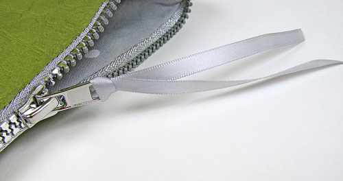 - Thread a length of ribbon through the zipper pull and knot in place.