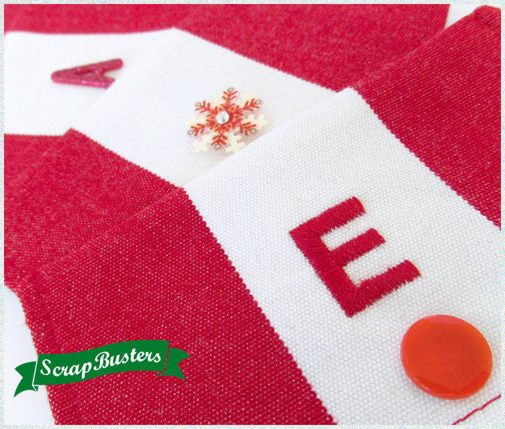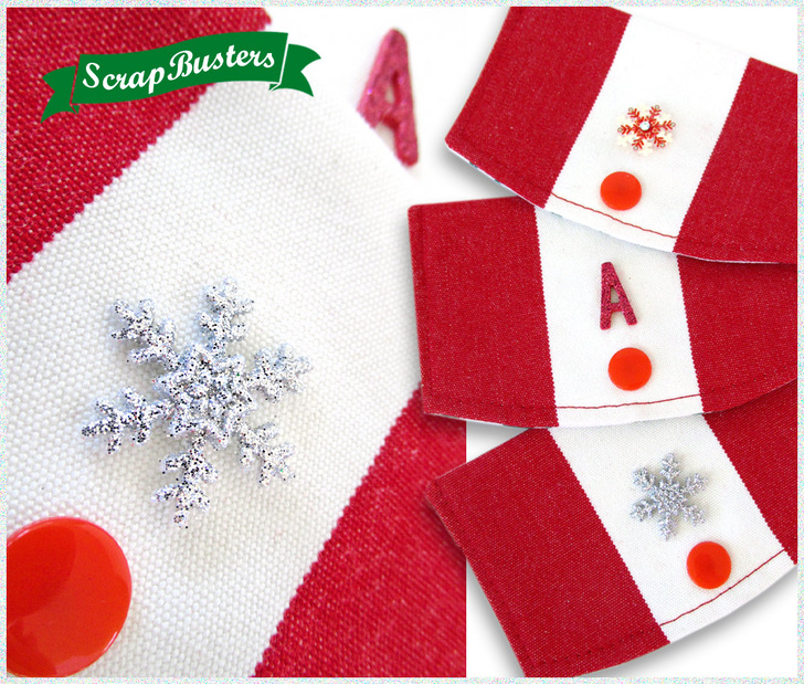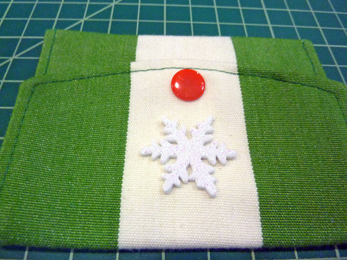 As extra personalization, we added a bit of embellishment on each flap. Thanks to the world of scrapbooking, the choices for adhesive shapes and letters are nearly endless. We found our four seasonal options in the blink of an eye at a local craft store: three different sparkling snowflakes and a glittering dimensional letter set. The strength of the adhesive is just right for gift giving, allowing the element to be removed for after-holiday use if so desired. For a stronger bond, simply add a drop of permanent fabric glue.