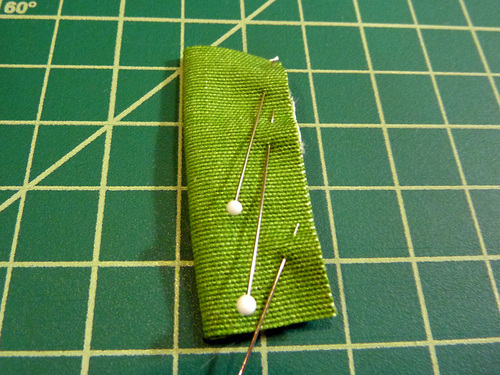 - Find the 1½” x 2″ strip. Fold the strip in half lengthwise, wrong sides together, so it is now ¾” x 2″. Pin along the 2″ side.