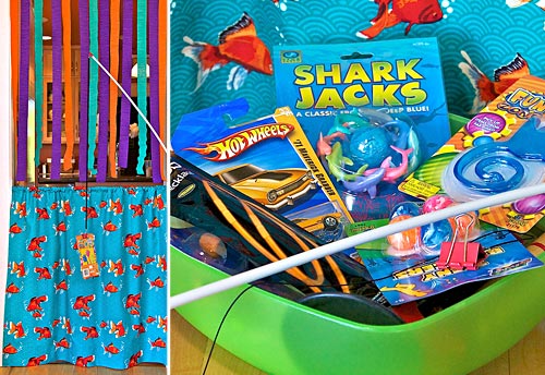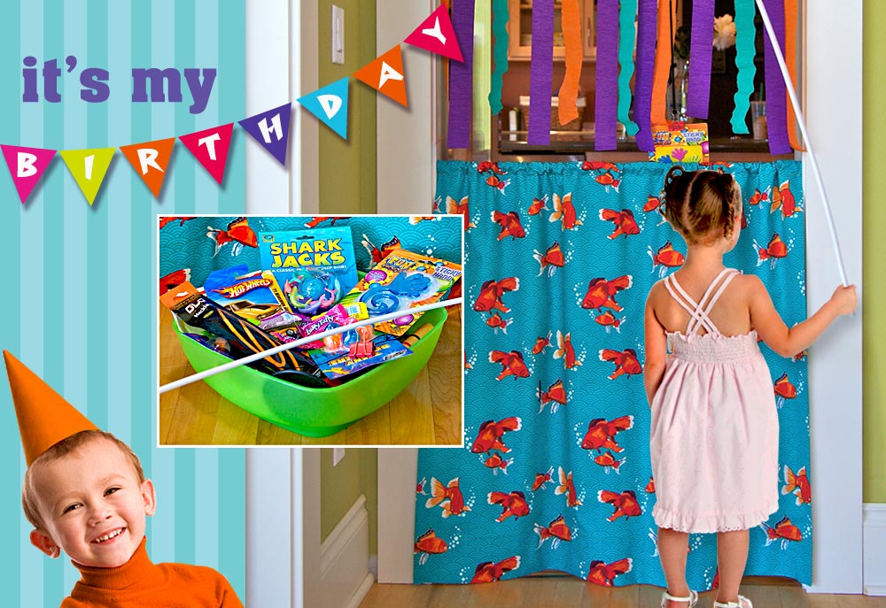 “Here Fishy, Fishy.” Make your own colorful curtain for this classic kid’s party game. Johnny (or Janie) stands in front of the curtain with a pole; mom or dad is on the other side with a bowl of prizes to clip to the end, guaranteeing the day’s friendliest catch. It’s a fun game they’ll fall for, ‘hook, line and sinker.’ As an added benefit, you can use the curtain to cover a real window after the party’s over.