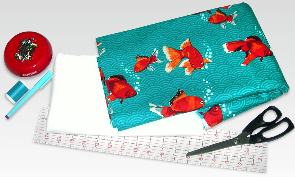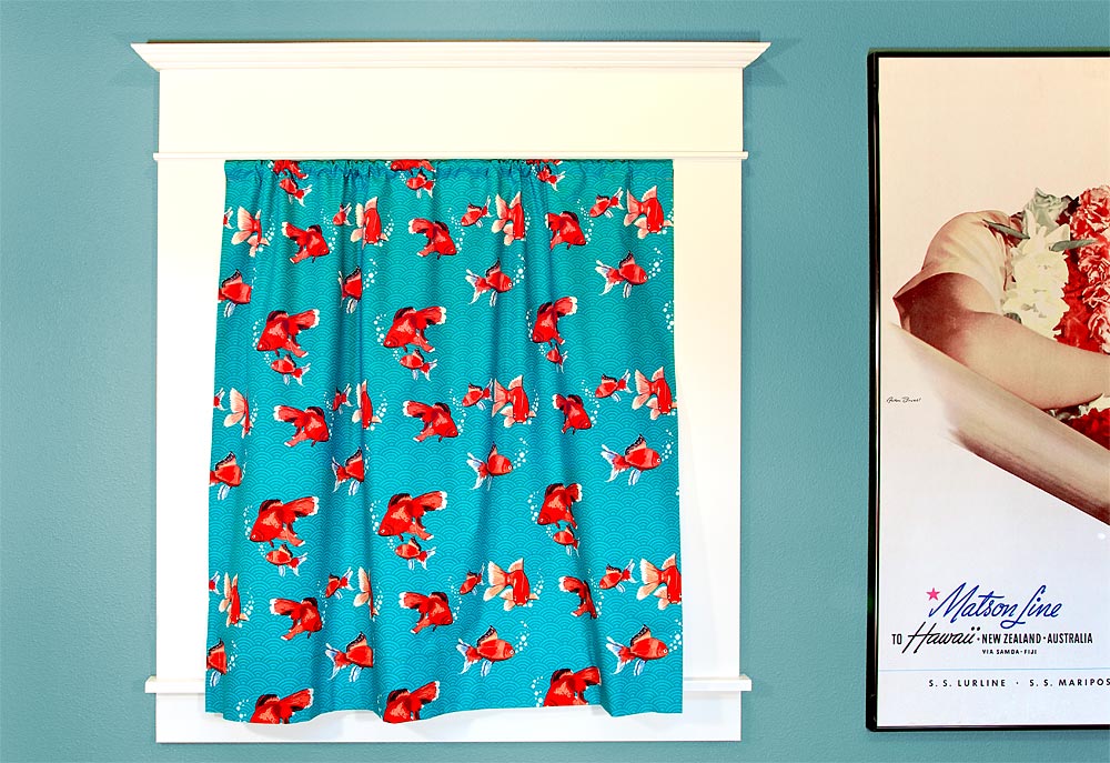 - 1¼ yard of 44-45″ fabric for the front of the curtain. It’s best to use an ocean-themed fabric: we used Patty Young’s Playdate from Michael Miller Fabrics in Teal Goldfish
