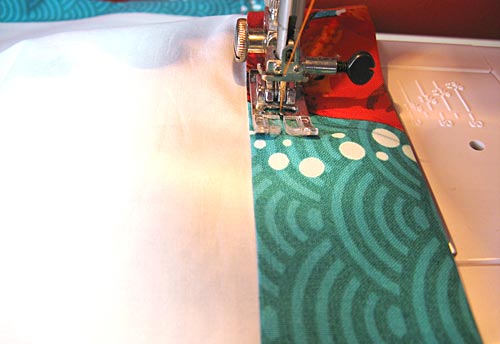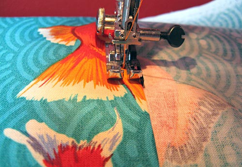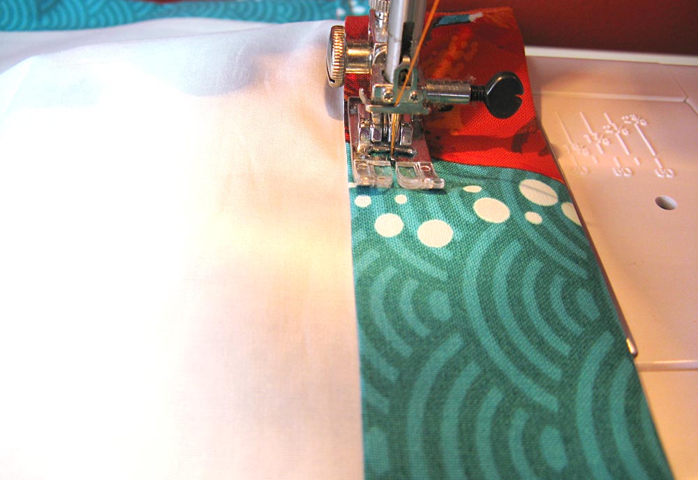 NOTE: We used contrasting thread (orange) in the top and bobbin for a bright accent. It’s your choice to use contrasting or matching.