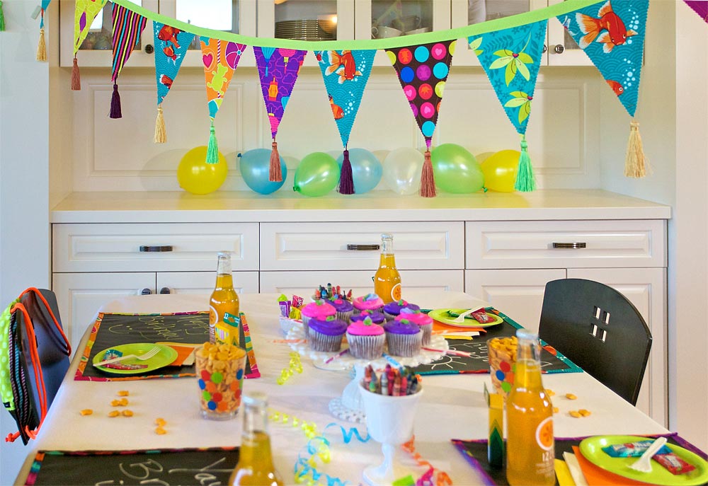 Use up your scraps on this festive bit of fun for a special birthday or everyday room décor. Our party banner turned out to be so colorful and cute, I’m tempted to leave it up year ’round. It adds a super splash of color and the extra-long tassels shimmer in the sun.