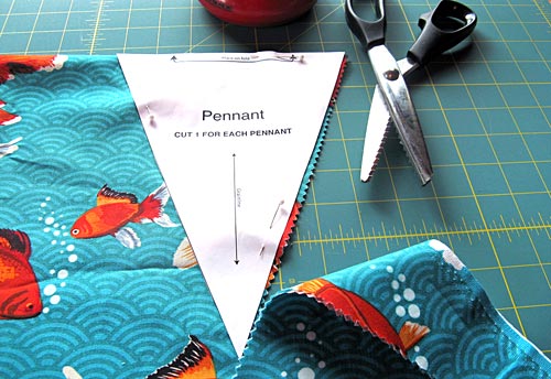 - Using the pattern (as noted on the pattern piece, you cut along the fold), and your pinking shears, cut FIFTEEN pennants. We mixed and matched to get a very colorful look. As mentioned above, take the extra time to fussy cut the fabric so you have a nicely centered design on each pennant.