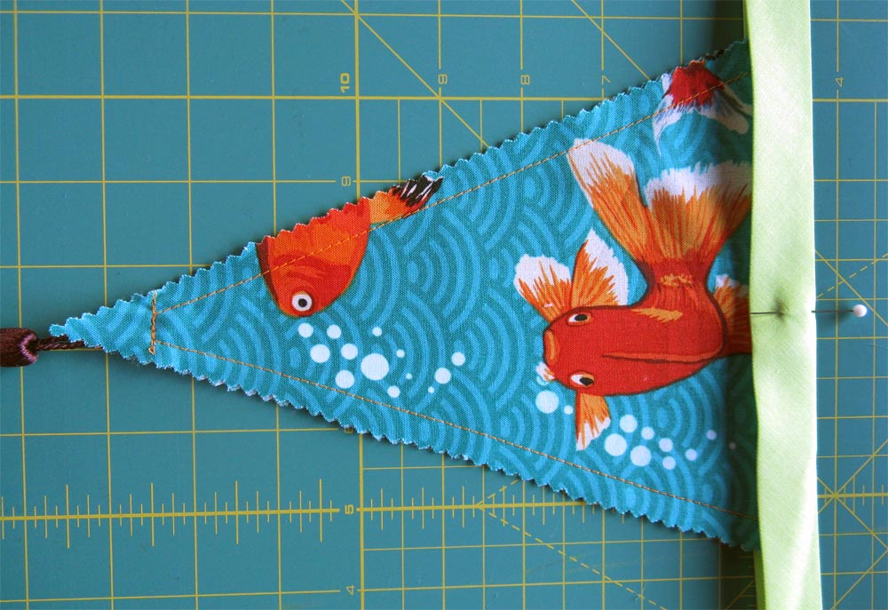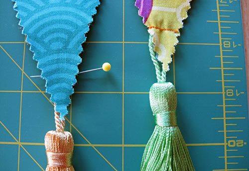 - Slip each tassel in between the layers of the pennant, positioning the tassel so it will hang freely below the point of the pennant. Pin the tassel in place. As you see in the photo, you will stitch each tassel right about where you pin.