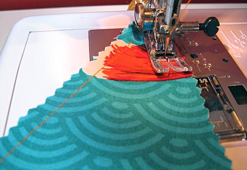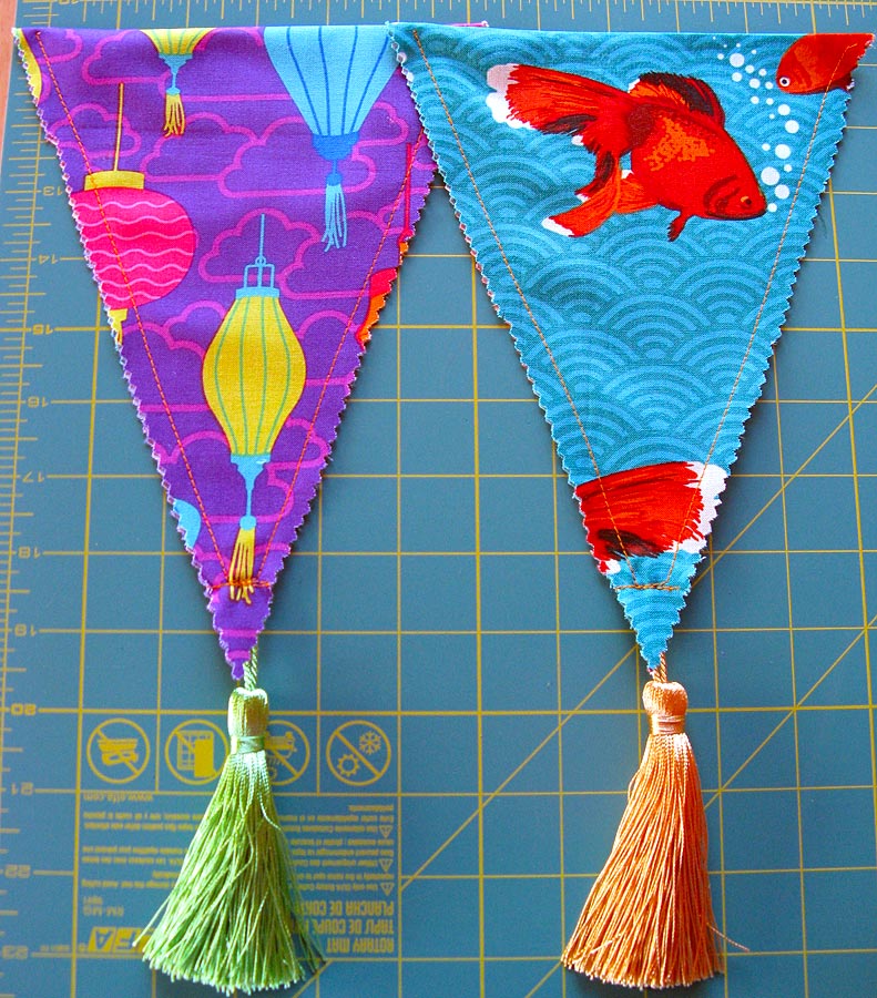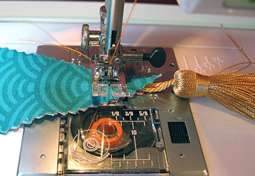 NOTE: We are stitching the tassels in place in this manner to make it easier for you to preserve the nice point of each pennant. It is very challenging to stitch down into a point and back out again without crunching and smooshing the fabric. However, you still need to be sure your machine can handle stitching back and forth like this, running on and off the very edge of the fabric. You need a machine with a precise fabric feeding system with very good feed dogs… like, say… a Janome!