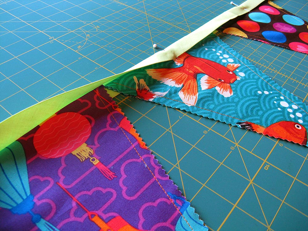 NOTE: I chose a wide zig zag to stitch my binding; I though it kind of matched the triangular shape of the pennants. - Stitch the long binding tail (what will become the ties) closed, the continue across all 15 pennants, securing them in place. Finally finish by stitching the opposite binding tail closed with a matching tiny folded hem on the opposite raw end.