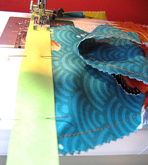 - Open up all three packages of binding and sew them together end to end, right sides together and with a ¼” seam allowance, to make one loooooooooong strip.