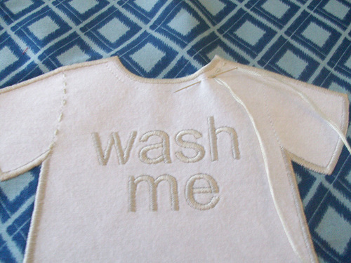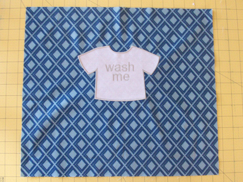 - Hoop the fabric with stabilizer and embroider the Wash Me design, following the instructions included in the free download. When the embroidery is complete, remove the excess stabilizer. Press the completed design from the wrong side.