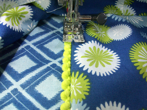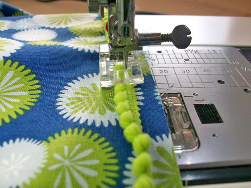 - Machine baste the pom pom trim in place. We switched to our Janome Beading foot and so didn’t need to pin. You could also pin or hand-baste the poms in place and use a Zipper foot.