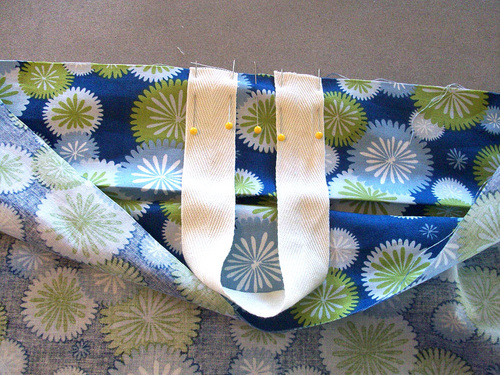 - Fold the twill tape up and over the folded edge, toward the top of the bag. Pin the tape in place.