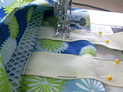 - On the right side of the fabric, edgestitch around each drawstring opening.