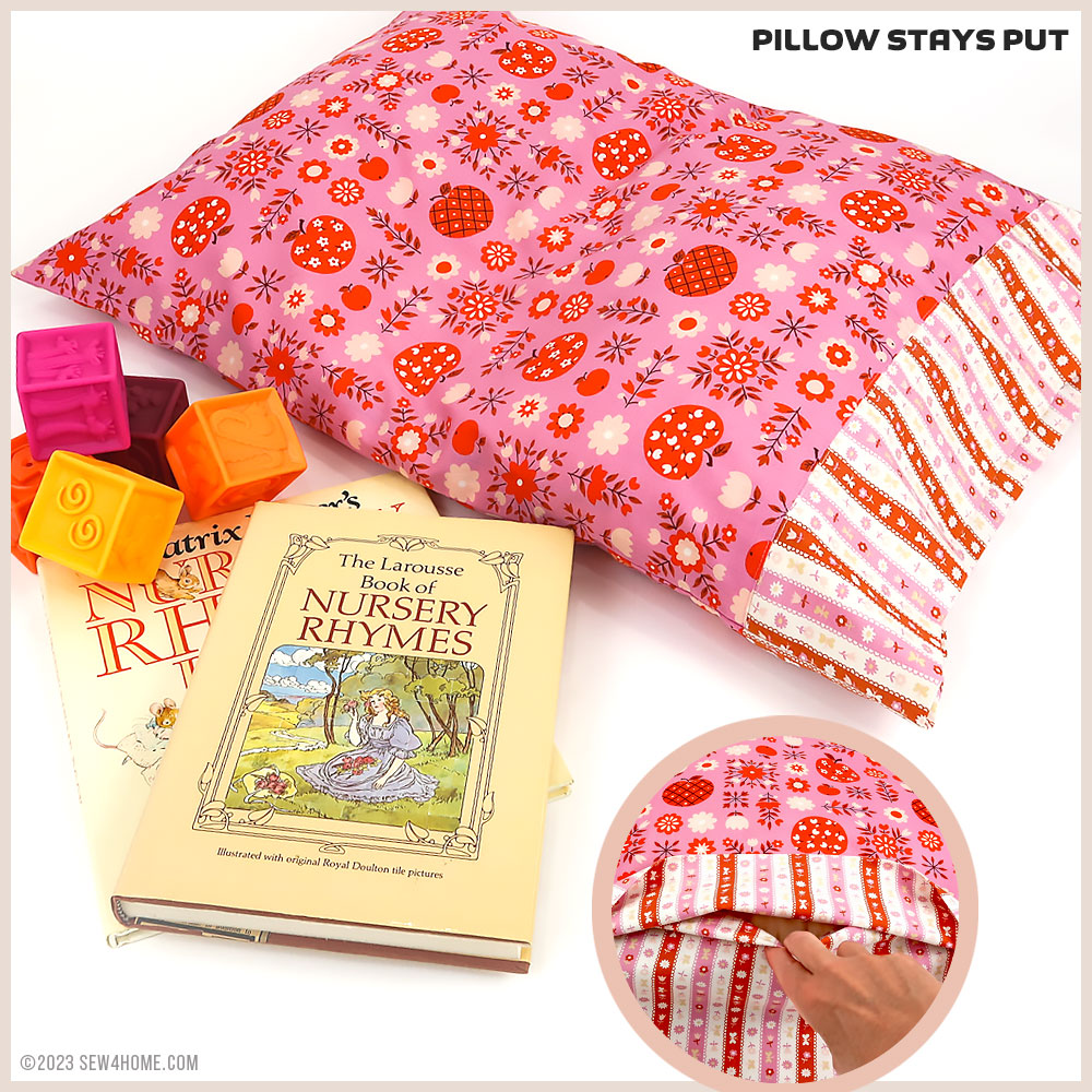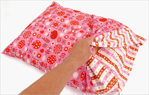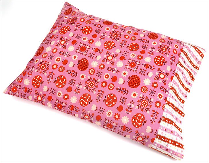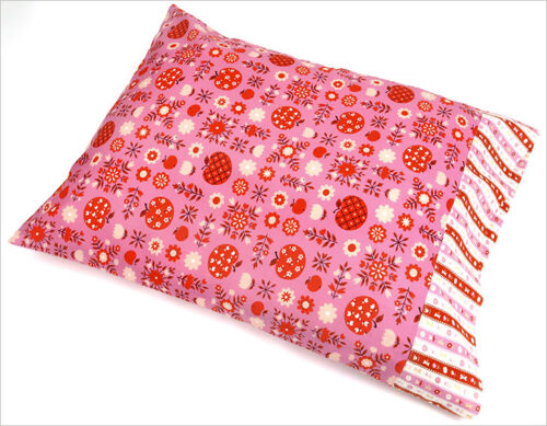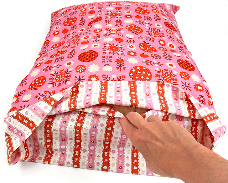 The pillowcase is made from two standard quilting cottons, one for the main panels and a second for the overlapping ends. If you’re new to making a closed-end case, after this project, it may just become your go-to favorite. A wide “pocket” slips over the pillow itself, holding the pillow in place and hiding it from view. We have a second overlapping-ends pillowcase with an added accent flange you can review here and a jumbo body pillow version here.