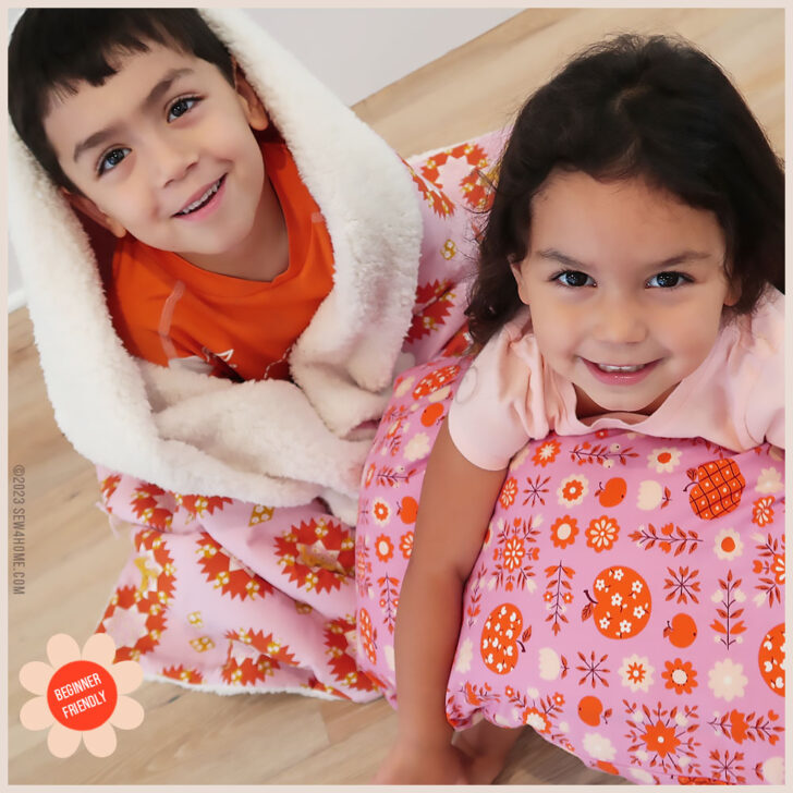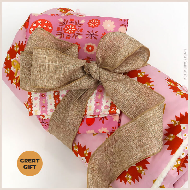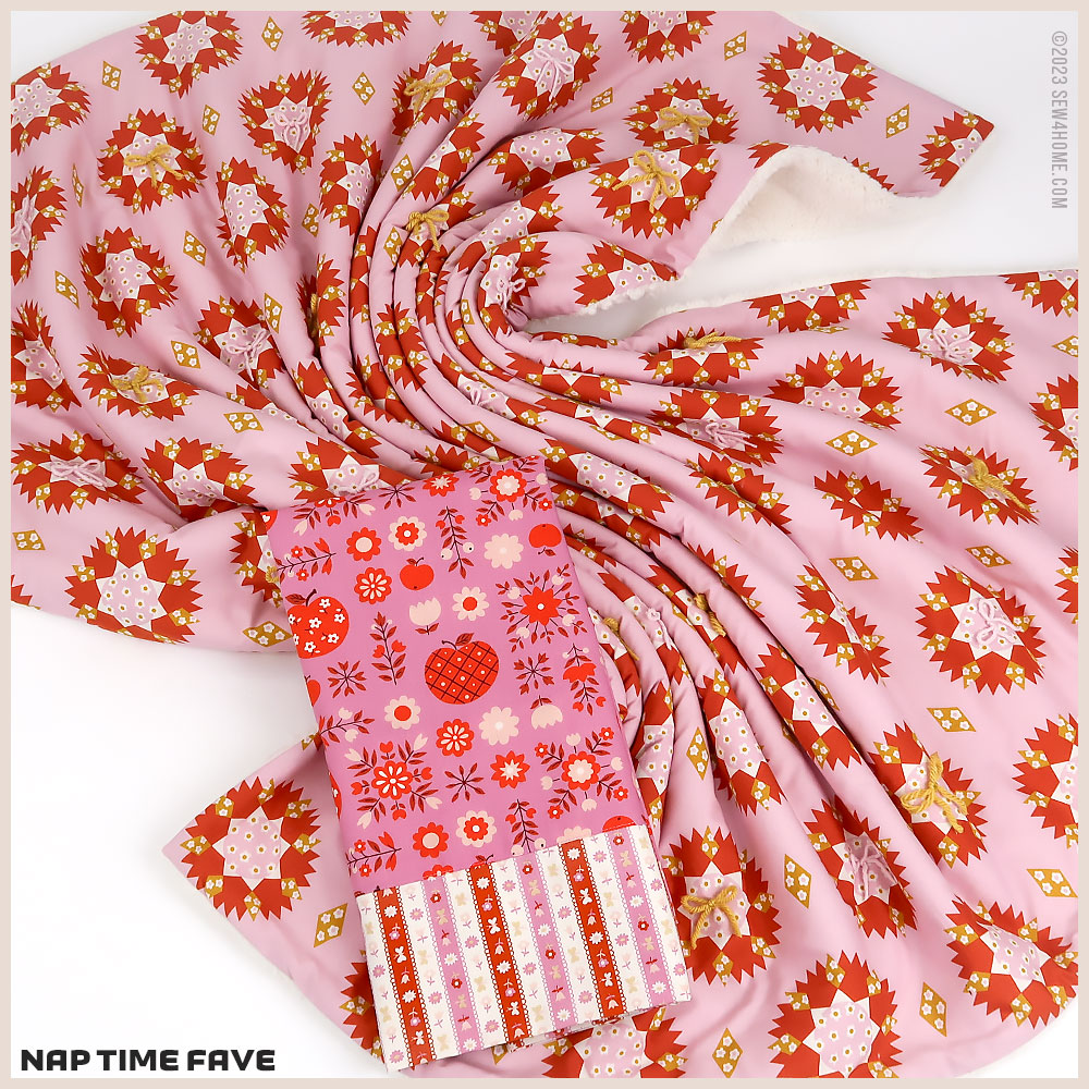 The cozy blanket is made up of just two layers: a lovely printed quilting cotton and a lush faux sherpa fleece. The deep pile of the sherpa eliminates the need for additional batting, although you can always choose to add a layer if desired.