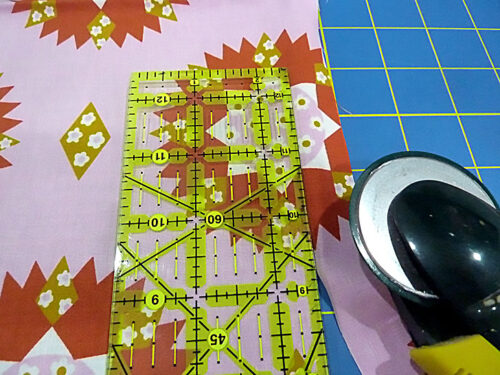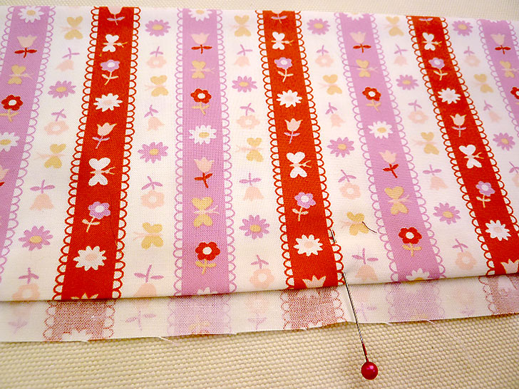 NOTE: If working with a stripe-like motif, as we did, make sure your motif is running straight and true side to side and top to bottom. With a 44-45” width fabric, you’ll be trimming off just a thin strip.