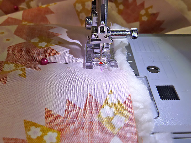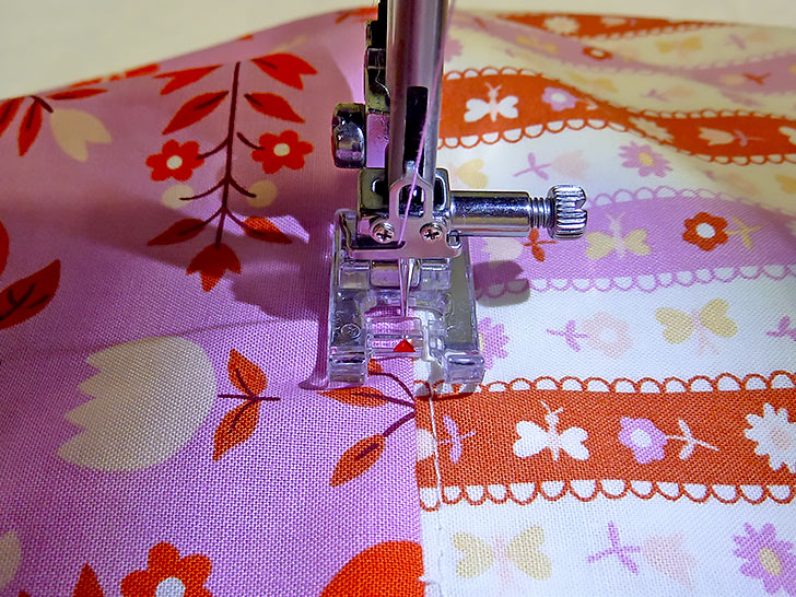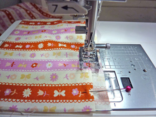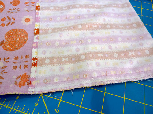 - Stitch across each panel, running the seam just to the left of the main panel/end panel seam within the main panel. You are stitching through the main panel itself as well as through the seam allowance which you should have pressed down towards the main panel. This edgestitching secures the seam allowance in its down position.