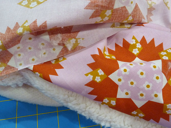 - Smooth together the layers and then add some pins to hold that smoothness; the cotton likes to cling to the sherpa.