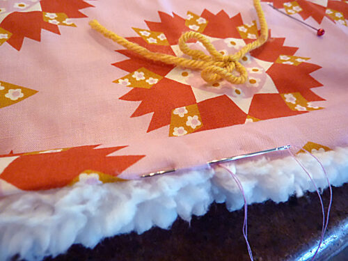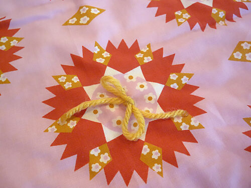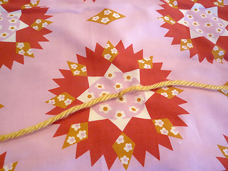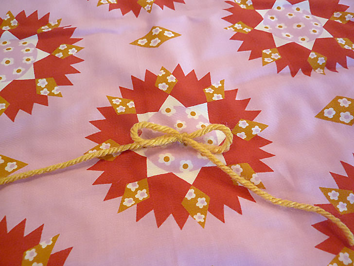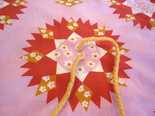 We added 40 yarn bows in two colors at the center points of our fabric’s sunburst motif. The number ties you’ll need will depend on your fabric and what looks best to you. You can, of course, choose to use a single color or even more than two colors. A rainbow could be cute!