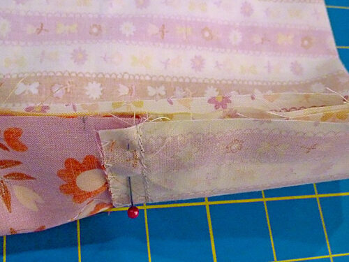 - Place an end panel right sides together with the top of each main panel. Remember, one end panel is longer than the other. The longer end panel will become the bottom overlap, so if you have a specific front and back to your main panels, pin the longer end panel to the back main panel and the shorter end panel to the front main panel.