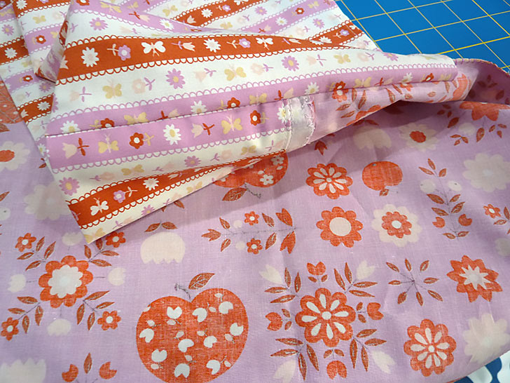 - Here’s a view prior to turning right side out, showing the side seams (no horizontal stitching across that top fold!) and the seam allowance finishing stitches.