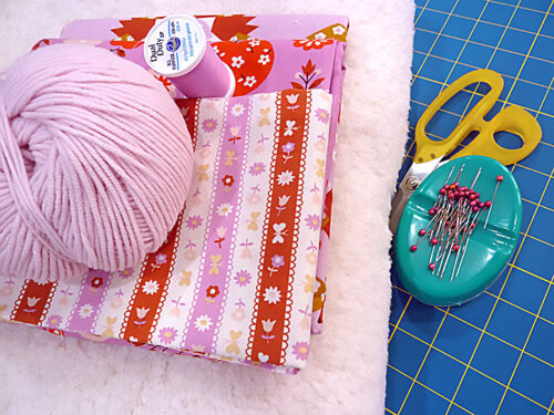 NOTE: As mentioned above, the blanket finishes at approximately 42” x 48”, but getting a full 1½ yards of the cotton allows a bit extra to fussy cut your motif so it is centered side to side and top to bottom. The faux sherpa fleece is traditionally sold in wide widths, and as a solid, does not need fussy cutting. It can be cut WOF (width of fabric) at 49” x 43” with just the specified 1¼ yards. - ONE small skein of yarn in one or two colors for hand tying; we used two colors to coordinate with our print fabric: pale pink and warm tan