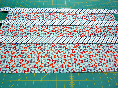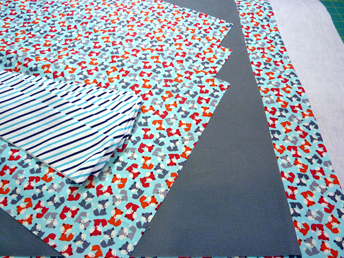 NOTE: Because we used a solid canvas with no directional motif, we cut our back panel to most efficiently use the yardage: 21″ high x 31″ wide. - From the binding fabric (stripe flannel in our sample), cut SIX 2½” x width of fabric (WOF) strips.
