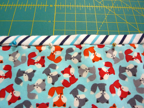 - On the front of each pocket panel, place pins ‘in the ditch’ of the binding seam line, which is right along the seam line of the panel and binding. This will catch the edge of the binding which should sit, as described above, just beyond the seam at the back.