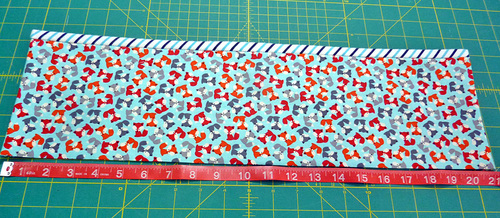 - Find the three pocket panel pieces. Press each in half, wrong sides together, so they are now 22” wide x 6” high. Set aside.