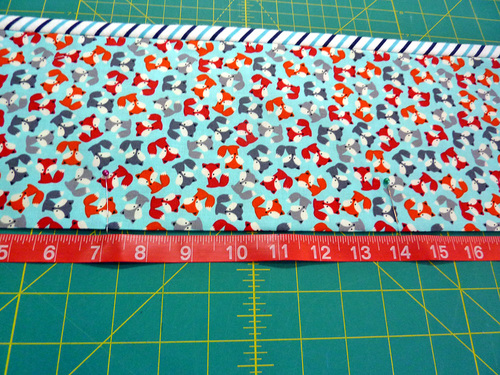 - From the fabric for the caddy front and pockets (mini foxes in our sample), cut the following: