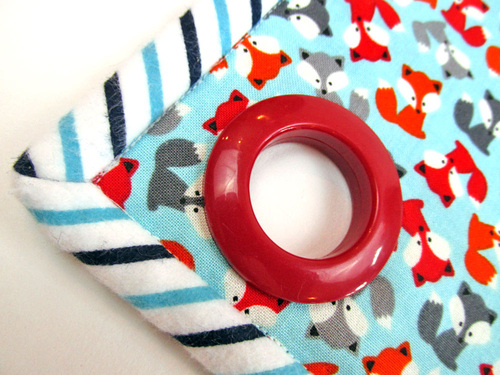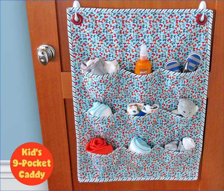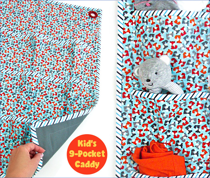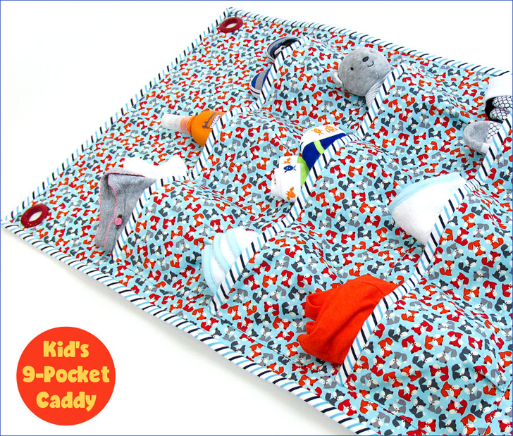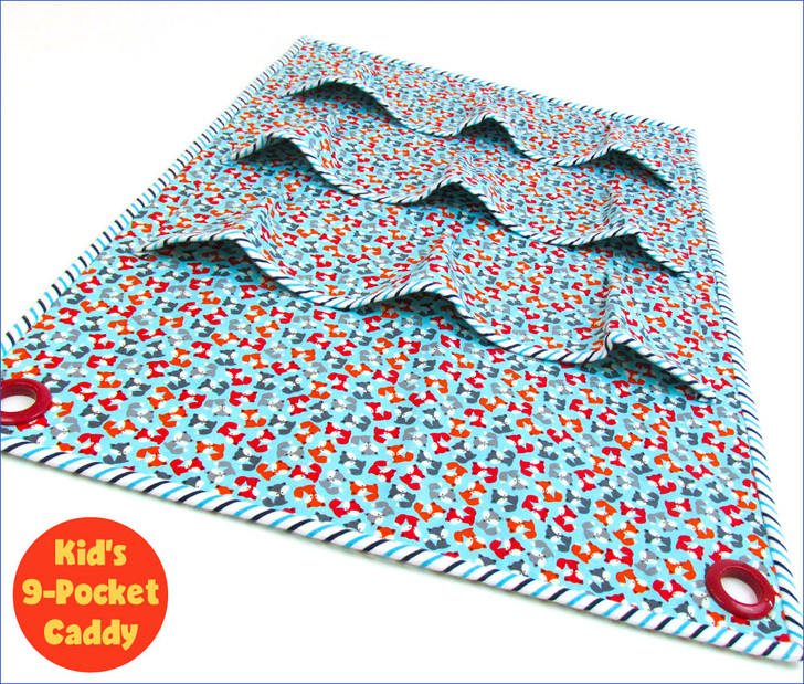 As any aspiring Mary Poppins will tell you, making picking-up fun gets the job done more quickly and easily. Use a bright, happy print and hang the caddy at kid-height. We originally chose some frisky foxes from Robert Kaufman’s adorable Urban Zoologie collection, and the binding is done is a soft flannel.