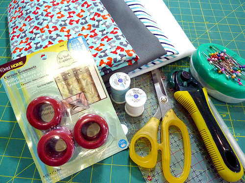 - Two 1″ drapery grommets to coordinate with fabric; we used Dritz Home Curtain Grommets in a red we had in our stash, which was a promotional color; white, black or pewter would also work well