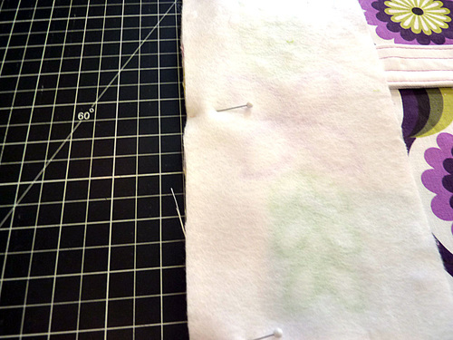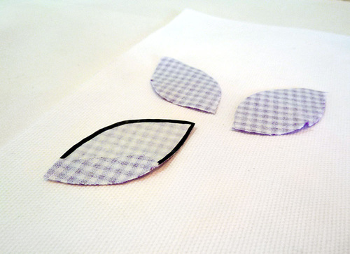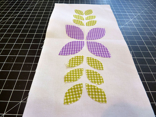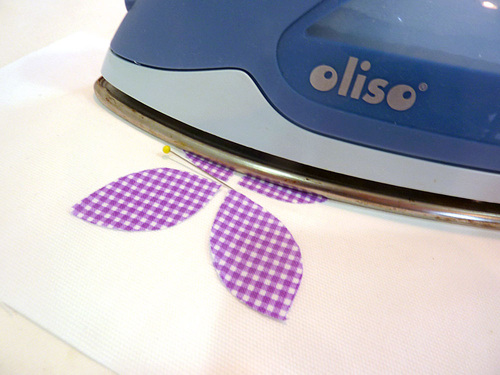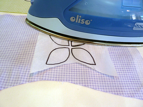 - As you can see in the finished images above, we used two different colors for our floral appliqué and so cut apart that traced design to fuse it in three sections. Two sections were fused to the wrong side of a scrap of the Lime Green Tiny Gingham…