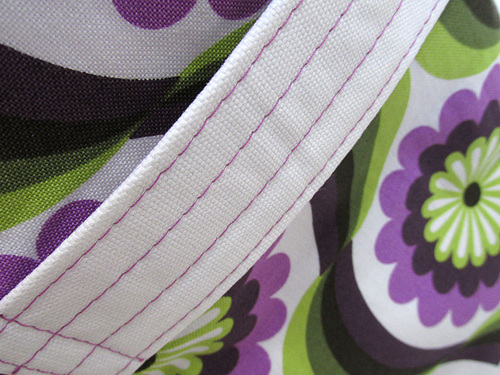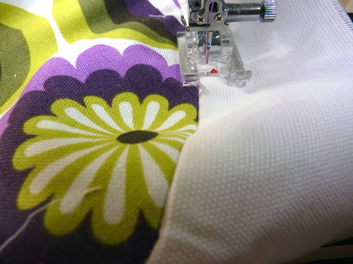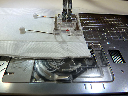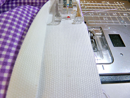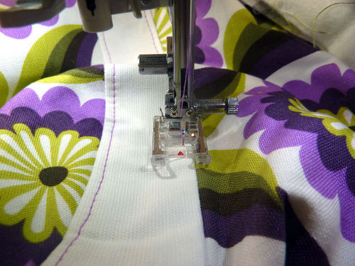 - Slightly lengthen your stitch length and topstitch all the way around along the top edge of the accent panel. As best you can, match the distance from the edge of the panel to the topstitching seam top and bottom. If your machine has a free arm, now is a good time to use it.
