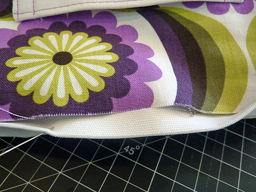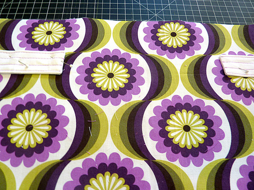 - Edgestitch each end of each handle in place, then run an additional parallel line of stitching ⅜” in from the edgestitching (both ends – both handles).