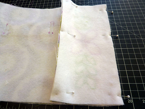 - Slip the main body loop over the base unit so the two pieces are right sides together. Align the bottom edge of the main body with the top edge of the bottom accent panel, matching up the front and back center-point pins of each piece. Pin in place all around.