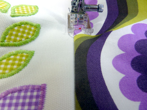 - Slow and steady wins the race when it comes to appliqué. We like the Janome Satin Stitch foot, which is see-through and has a handy red arrow you can use as a guide to insure your stitching stays half in the appliqué and half in the base fabric. Don’t be afraid to stop, with your needle in the down position, and adjust your fabric as you move around the curves.