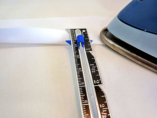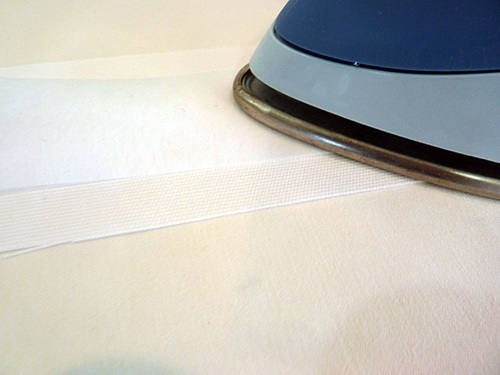 - Place the interfacing down the center of the wrong side of the fabric strip (1″ from the top and bottom). Following manufacturer’s instructions, fuse in place.