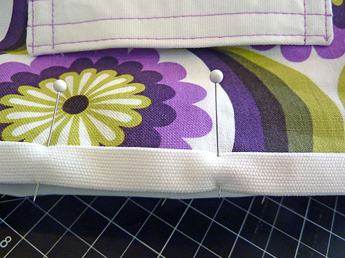 - Bring the folded edge of the accent panel up and over the top raw edge of the exterior panel, pinning the folded edge in place against the exterior panel to create the finished top edge.