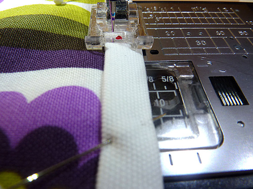 - Bring the remaining raw edge of the main body panel around, forming a tube, and pin it, right sides together, with the remaining raw edge of the center appliqué panel.