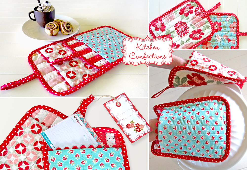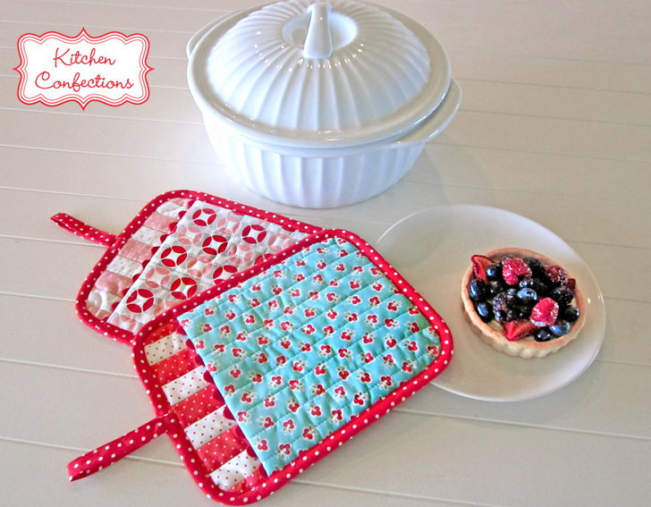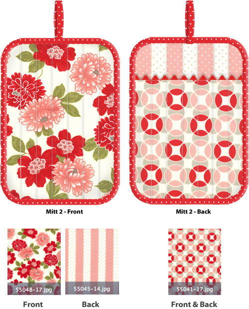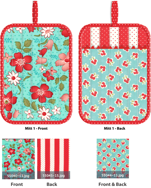 Supplies listed below are for TWO coordinating oven mitts; each finishes at approximately 7″ x 9″ (excluding the loop).