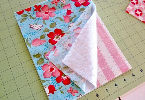 - For each oven mitt back (pocket), find ONE of the back fabric blocks and an insulated fleece block. Layer the insulated fleece and the fabric wrong sides together.