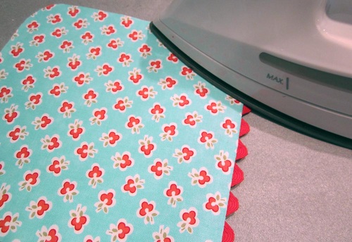 - Fold the lining back so the rick rack now stands straight up and both the front and the back of the pocket have right sides showing. Match the curved raw edges and pin in place. Press.