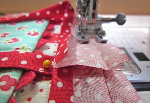 NOTE: If you’re new to working with bias tape, the number one rule is ‘slow and steady wins the race.’ You’re sewing around a curve, which is trickier than a straight line and are binding several layers. Don’t fear the pin! Use plenty, removing them as you go. For more hints, check out our tutorial: Bias Binding: Figuring Yardage, Cutting, Making, Attaching.