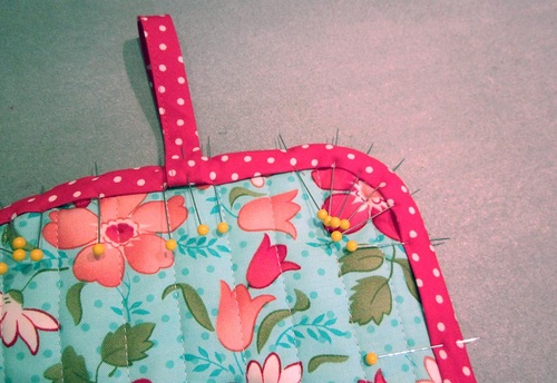 - Fold the bias tape to the wrong side of the oven mitt, covering the line of stitching. Pin in place.