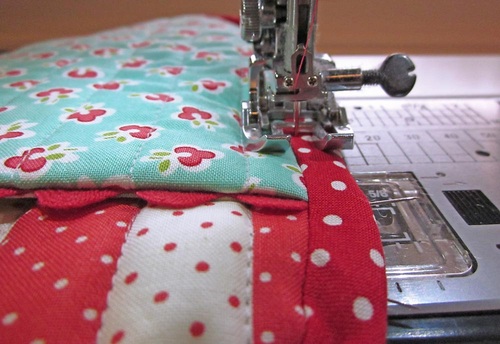 - From the pocket side of the mitt, edge stitch the bias tape, making sure to catch the fold on the underside as you sew.