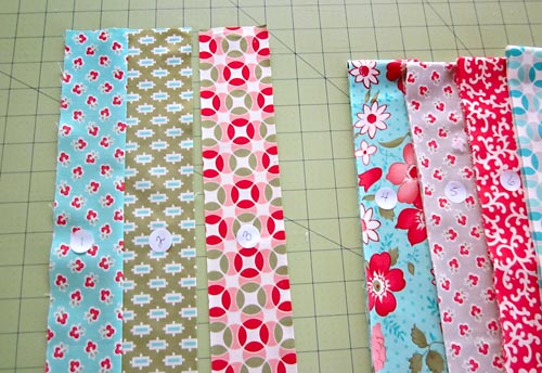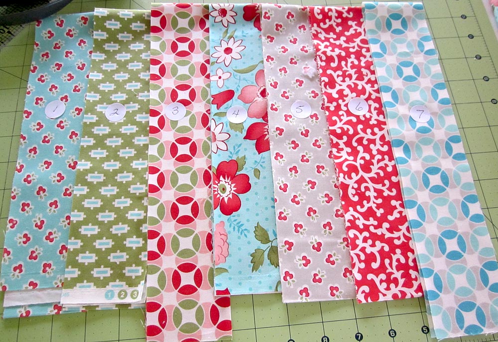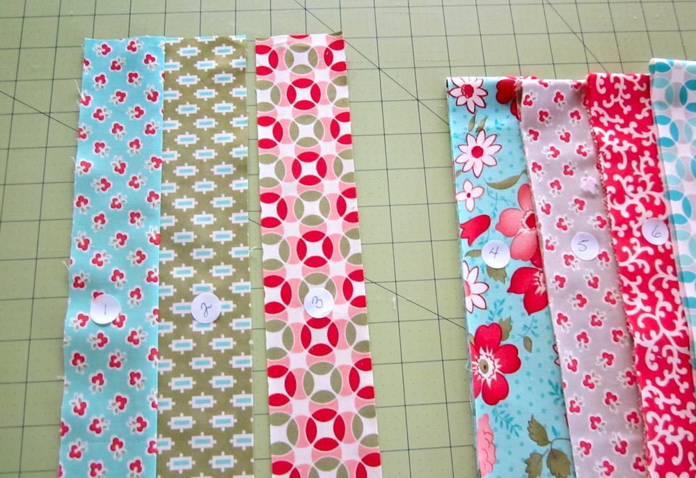 - To do this, place the first two strips right sides together, aligning one 25″ side. Pin in place. Stitch together. Add the third strip to the remaining 25″ raw edge of the sewn pair. Pin and stitch in the same manner. Continue in this manner to create a finished strata 14½” x 25″.