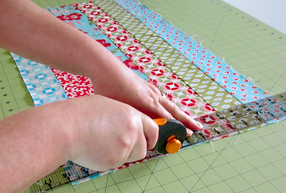 - Using a rotary cutter, quilt ruler and cutting mat, square the end of the strata, removing as little fabric as possible. This means aligning your strata along a cutting mat grid line, then also aligning your ruler along the grid lines and trimming the edge perfectly straight.