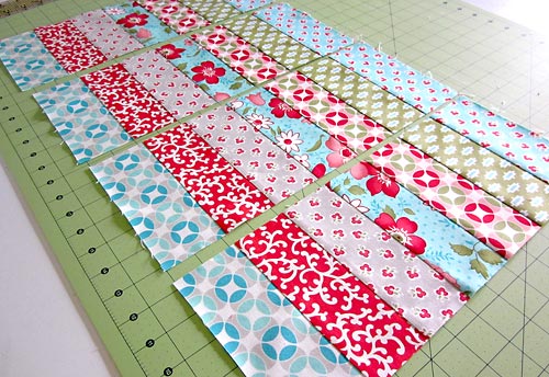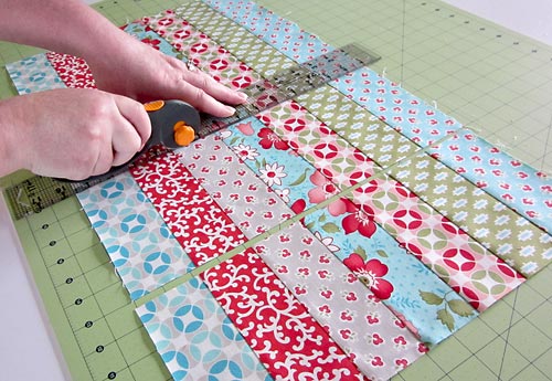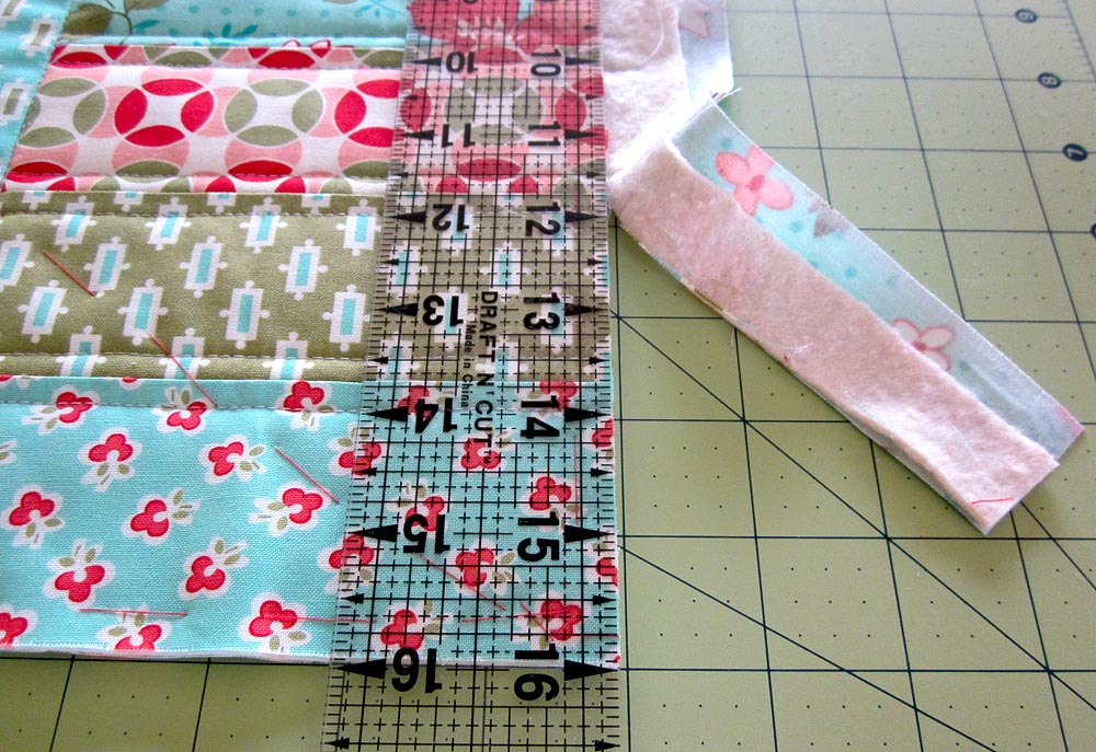 - Cut the squared strata into four 6″ strips, one for each of the four placemats.
